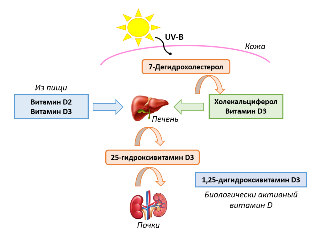 Синтез D-гормона включает превращение 7-дегидрохолестерина в коже в превитамин D₃, а затем в витамин D₃ под действием УФ-В излучения (примерно 290–315 нм, максимум около 295–300 нм). Витамин D₃ (а также витамин D₂ из пищи) гидроксилируется в печени до 25-гидроксивитамина D₃ (25(OH)D, кальцидиол), а затем в почках — до 1,25-дигидроксивитамина D₃ (1,25(OH)₂D, кальцитриол), биологически активной формы. Источник