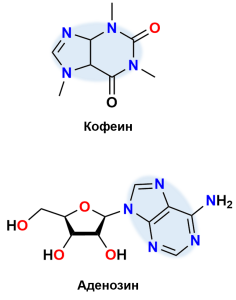 Обратите внимание на то, насколько похожи их центральные кольцевые структуры (выделены голубым цветом). Именно благодаря этому сходству кофеин может обмануть рецепторы на нейронах, заставляя их «считать» его аденозином.