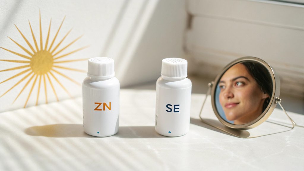 Эти минералы работают в тесной синергии с витаминами-антиоксидантами: витамин С не только улучшает усвоение железа, но и регенерирует витамин Е, защищающий липидные мембраны от перекисного окисления. Витамин А, в свою очередь, зависит от цинка для транспорта и метаболизма — что особенно важно для барьерной функции кожи.