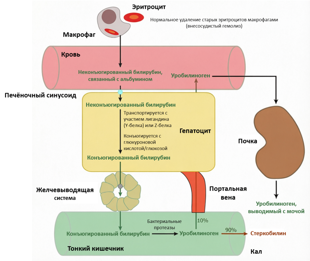 - Голодание и низкокалорийные диеты — снижают захват билирубина гепатоцитами и усиливают «физиологический» гемолиз; провоцирующий эффект воспроизводится в клинических тестах (48 ч голодания → двукратный рост билирубина).