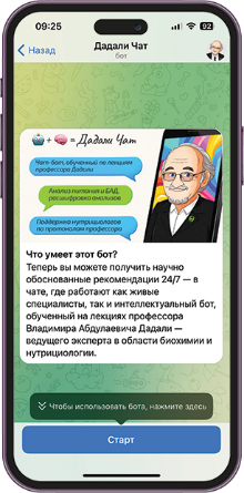 Инновационный сервис консультаций, объединяющий умный ИИ-ассистент, обученный на базе знаний профессора Дадали, и живую команду экспертов-нутрициологов. Возможности: